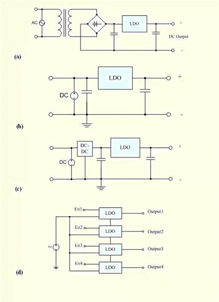 在某些應(yīng)用中,比如無(wú)線電通信設(shè)備通常只有一足電池供電,但各部分電路常常采用互相隔離的不同電壓,因此必須由多只穩(wěn)壓器供電。為了節(jié)省共電池的電量,通常設(shè)備不工作時(shí),都希望低壓差線性穩(wěn)壓器工作于睡眠狀態(tài)。為此,要求線性穩(wěn)壓器具有使能控制端。有單組蓄電池供電的多路輸出且具有通斷控制功能的供電系統(tǒng)如圖3-1(d)所示。