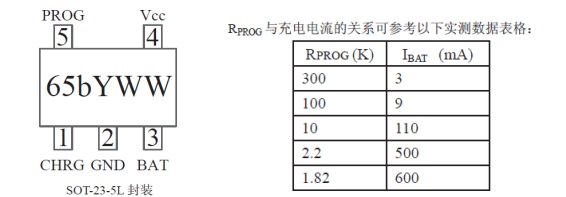 TP4065為SOT23-5封裝,相比TP4067少一個STDBY引腳,單燈指示;充電紅燈亮,充滿紅燈滅;