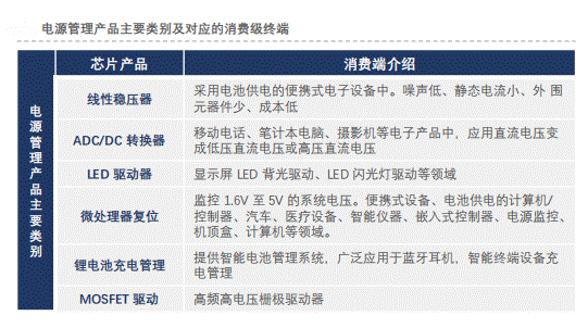 b.電源管理類模擬芯片產(chǎn)品:LED驅(qū)動電路以及線性穩(wěn)壓器、ADC/DAC轉(zhuǎn)換器、CPU電源監(jiān)測電路、鋰電池充電管理芯片、過壓保護電路及負載開關(guān)等非驅(qū)動類電源管理產(chǎn)品。