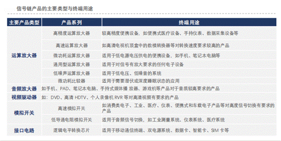 a.信號鏈類模擬芯片產(chǎn)品:放大器芯片(包括運算放大器、音頻放大器和視頻驅(qū)動器等)、模擬開關(guān)及接口電路等。