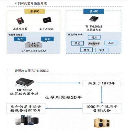 3.生命期:模擬IC產(chǎn)品生命周期一般不低于10年,一旦切入產(chǎn)品便可以獲得穩(wěn)定的芯片出貨量。先進制程對于模擬類產(chǎn)品推動作用較小,基本不受摩爾定律推動,因此模擬類產(chǎn)品性能更新迭代較慢。著名的音頻放大器芯片NE5532生命周期長達30年,至今依然是多款音響設(shè)備的標配芯片。