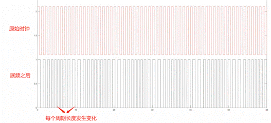 原本的時(shí)鐘信號每個(gè)周期都是一樣的,周期時(shí)間長度也一樣,為Tclk。我們可以對其進(jìn)行微調(diào),比如先將每個(gè)時(shí)鐘周期比上一個(gè)時(shí)鐘周期的時(shí)間加長一點(diǎn)點(diǎn),累計(jì)n個(gè)周期之后,再將每個(gè)時(shí)鐘周期比上一個(gè)時(shí)鐘周期縮短一點(diǎn)點(diǎn),再累計(jì)n個(gè)周期,如此循環(huán)。