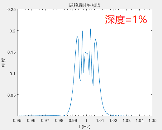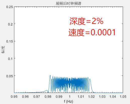 將調(diào)制速度從0.001改為0.0001,即降低10倍,調(diào)制深度為2%,頻譜如下圖。