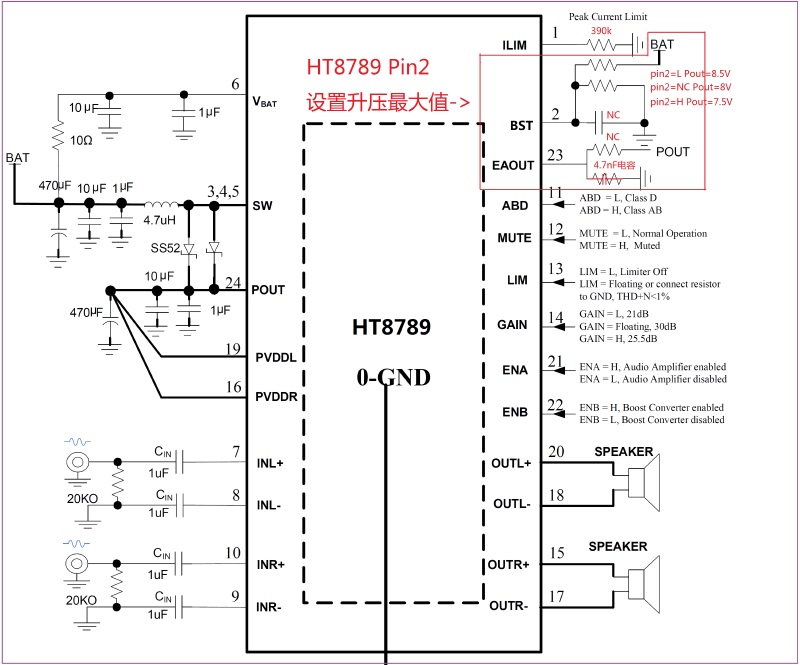 HT878 2X8.5W/2.7V-5.5V(內(nèi)置自適應(yīng)升壓模塊)/4Ω TSSOP-24 2.5V-5.5V 可任意限幅、單節(jié)鋰電池內(nèi)置升壓的8W雙聲道音頻功放IC