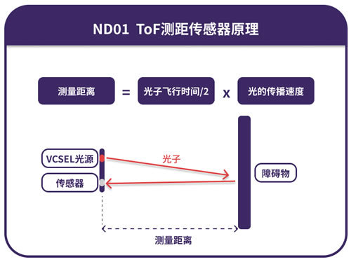 超小尺寸單點(diǎn)ToF傳感器,尺寸緊湊,基于飛行時(shí)間測距原理,通過內(nèi)置的VCSEL光源發(fā)射近紅外光,遇到前方的物體后光線反射,再由ToF接收芯片接收測得光的飛行時(shí)間,從而計(jì)算出距離信息。主要用于近距離精準(zhǔn)測距,例如掃地機(jī)、服務(wù)機(jī)器人等,用于探測周圍物體、墻面或者地面距離,實(shí)現(xiàn)避障、沿墻探測、懸崖探測等功能。