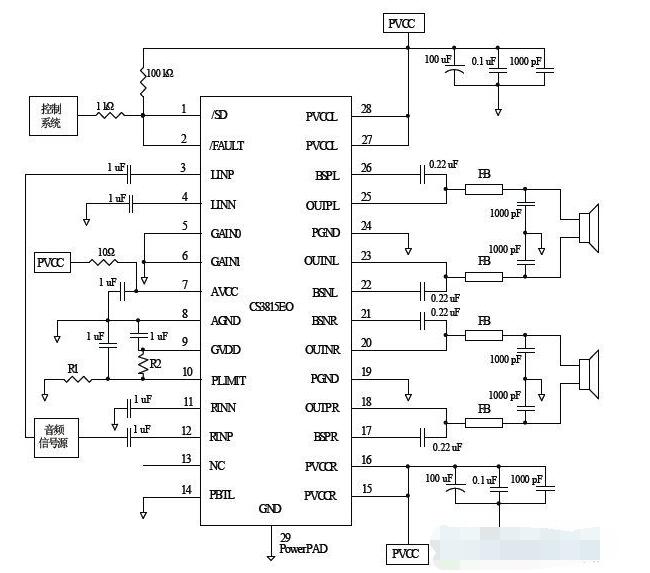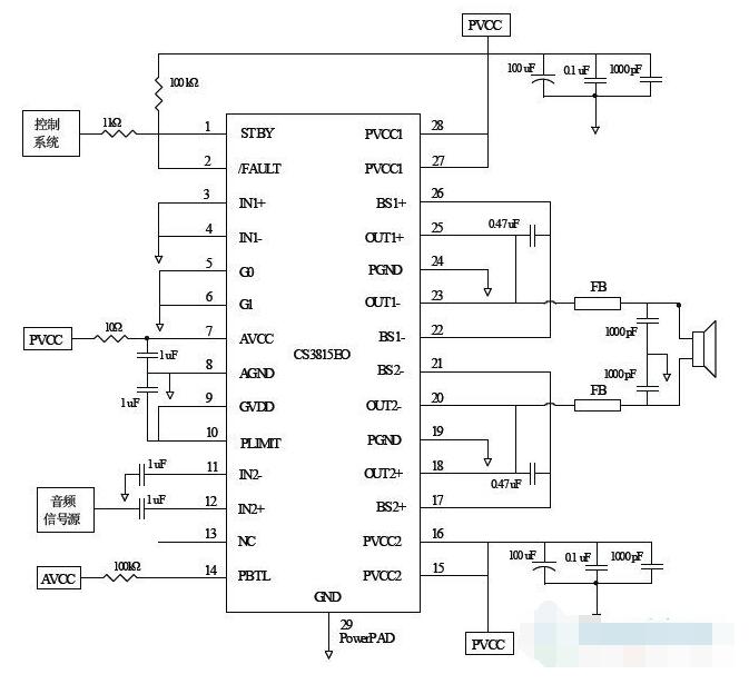CS3815EO是一款15W(每聲道)立體聲高效D類音頻功率放大電路。它采用先進的EMI抑制技術(shù)使得在輸出端口采用廉價的鐵氧體磁珠濾波器就可以滿足EMC要求。其內(nèi)部包括一個功率可調(diào)限制器和直流檢測電路來對揚聲器進行保護。功率可調(diào)限制器允許用戶設(shè)定一個比電源電壓低的虛擬電壓來限制流過揚聲器的總電流,直流檢測電路在輸入電容損壞或者輸入短路時關(guān)斷輸出級。電路具有高達90%的效率,使得在播放音樂時不需要額外的散熱器。CS3815EO應(yīng)用于LCD電視、消費類音頻設(shè)備。