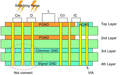 此外,如果在第三層上有公共接地,在第四層上有信號接地,則電源接地與第三和第四層接地之間的連接僅連接高頻開關噪聲較小的輸入電容器附近的電源接地。切勿連接噪聲多的輸出或續(xù)流二極管的電源接地。參見下面的截面示意圖。