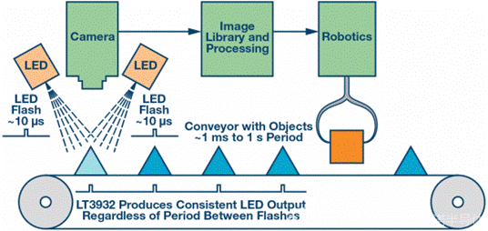 為了實現(xiàn)上述功能, ADI的高速LED驅(qū)動器LT3932可為高達2 A的LED串提供機器視覺相機閃光燈,關(guān)斷時間可以長達1秒、1小時、1天或更長時間,從而完美地解決這一問題。LT3932的特殊相機閃光燈功能允許其保持輸出電容和控制環(huán)路充電狀態(tài),哪怕是在長關(guān)斷時間內(nèi)。對輸出和控制環(huán)路電容的狀態(tài)進行采樣后,LT3932繼續(xù)在長關(guān)斷期間對這些元件進行涓流充電,以補償通常都會有的漏電流,而這是其他LED驅(qū)動器沒有考慮到的。