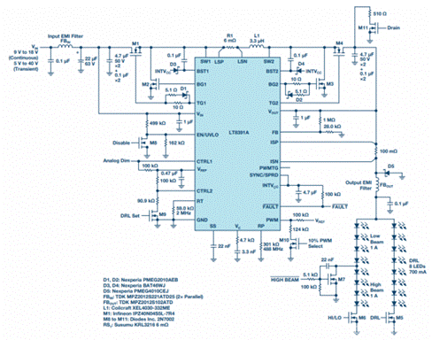 用于近光燈、遠光燈和DRL燈的LT8391A多光束LED車前燈組解決方案