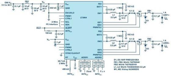 I2C串行通信功能簡化了每個LT3964支持的兩個獨立高電流LED通道的模擬和PWM調(diào)光功能,在單個I2C總線上有多達八個不同的LT3964地址。例如,上圖中的2 MHz雙通道1A降壓LED驅(qū)動器示例電路具有高效率和超小尺寸等特點,可將其更改為通過34 V至36 V輸入為每個通道提供高達30 V的LED電源,效率高于90%。