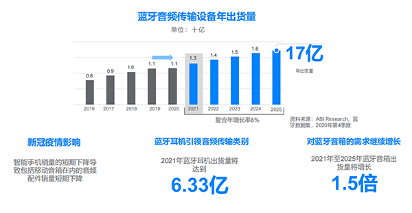 受新冠疫情影響,智能手機(jī)銷量的短期下降,導(dǎo)致了包括移動(dòng)音箱在內(nèi)的音頻配件銷量短期下降。2020 年藍(lán)牙音頻傳輸設(shè)備的年出貨量為 11 億,與上一年持平。但即便如此,藍(lán)牙耳機(jī)仍然引領(lǐng)了藍(lán)牙音頻傳輸類設(shè)備的出貨量,2021 年藍(lán)牙耳機(jī)出貨量將達(dá)到 6.33 億,幾乎占整體市場(chǎng)的一半。與此同時(shí),對(duì)藍(lán)牙音箱的需求將持續(xù)增長(zhǎng),2021-2025 年藍(lán)牙音箱出貨量將增長(zhǎng) 1.5 倍。根據(jù)預(yù)測(cè),整體藍(lán)牙音頻傳輸設(shè)備的年出貨量到 2025 年將達(dá)到 17 億。