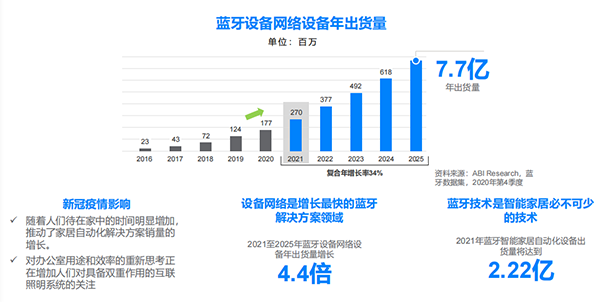 受疫情的影響,人們待在家中的時(shí)間明顯增加,這推動(dòng)了家居自動(dòng)化解決方案銷量的增長(zhǎng)。同時(shí),對(duì)辦公室用途和效率的重新思考,正在增加人們對(duì)具備雙重作用的互聯(lián)照明系統(tǒng)的關(guān)注。這將推動(dòng)設(shè)備網(wǎng)絡(luò)設(shè)備在未來(lái)五年實(shí)現(xiàn) 34% 的復(fù)合年增長(zhǎng)率,根據(jù)報(bào)告預(yù)測(cè),2021 年藍(lán)牙設(shè)備網(wǎng)絡(luò)設(shè)備的出貨量將達(dá)到 2.7 億。2021 年至 2025 年藍(lán)牙設(shè)備網(wǎng)絡(luò)設(shè)備年出貨量將增長(zhǎng) 4.4 倍。