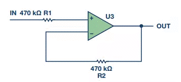 電阻熱噪聲的計(jì)算公式為√4kTRB,故1 kΩ電阻會(huì)有4 nV/√Hz的噪聲。增加電阻會(huì)增加噪聲。圖2中,出人意料的是,雖然909 Ω補(bǔ)償電阻是值最低的電阻,但由于從該節(jié)點(diǎn)到輸出端的噪聲增益,它給圖2輸出端貢獻(xiàn)的噪聲最多。R1引起的輸出噪聲為40 nV/√Hz,R2為12.6 nV/√Hz,R3為42 nV/√Hz。因此,請(qǐng)勿使用電阻。另一方面,如果運(yùn)算放大器采用雙電源供電,并且一個(gè)電源先于另一個(gè)電源上電,那么ESD網(wǎng)絡(luò)可能發(fā)生閂鎖問題。這種情況下,可能希望增加一定的電阻來保護(hù)器件。但若使用的話,應(yīng)在電阻上放置一個(gè)旁路電容以減少電阻的噪聲貢獻(xiàn)。