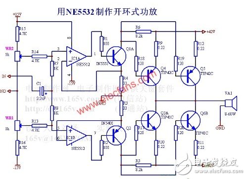 運放采用NE5532雙運放,Q1、Q2選中功率管IN5550、5401等,末級功放管可選用三肯對管TIP41C、TIP42C或TIP36C、TIP35C等音頻對管,電阻用1/4W金屬膜電阻
