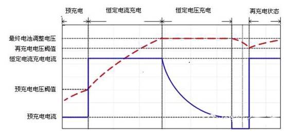 除了上面的流程描述,它還具有自動重新充電、最小電流終止充電等特性。一般來說,恒壓充電結(jié)束時的小電流充電過程中,電流的大小一般為恒流充電時電流的十分之一。目前在鋰離子電池充電器的設(shè)計中,對手機(jī)充電結(jié)束后由于某種因素放電的情況而專門設(shè)計了檢測電路,一旦檢測到電池電壓降低,就會重新啟動充電過程(見上圖)。