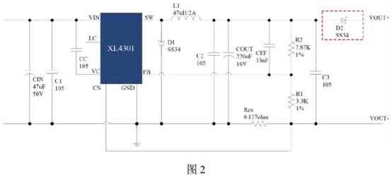 以XL4301鋰電池充電電路為例,如圖2、圖3所示(紅色虛線框中為防電流倒灌電路)。輸入12V,輸出接單節(jié)鋰電池(3.1V-4.3V),最大充電電流0.8A;其中最大充電電流 IOUT=VCS/RCS=0.11/0.137≈0.803A,最大充電電壓 VOUT=VFB*(1+R2/R1)=1.25*(1+7.87/3.3)≈4.231V。