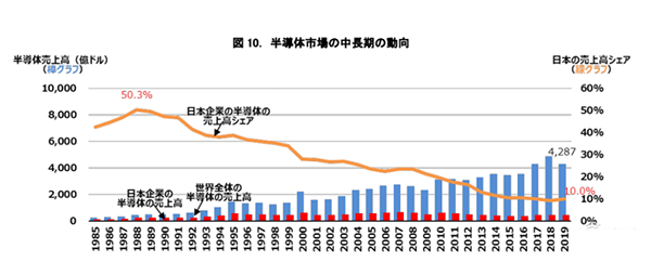 增長(zhǎng)戰(zhàn)略草案首先提到,日本半導(dǎo)體產(chǎn)業(yè)較之前有所衰落。日本增長(zhǎng)戰(zhàn)略委員會(huì)在草案中寫道,1988 年,日本在全球半導(dǎo)體市場(chǎng)的銷售份額為 50% 左右;2019 年,這一比例已經(jīng)降到了 10%。