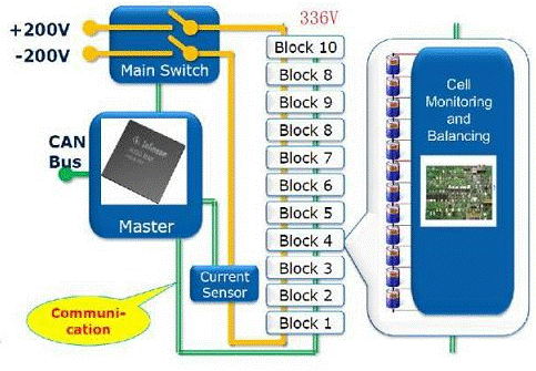 鋰電池儲能能力強(qiáng),但單個電池的電壓和電流都太低,不足以滿足混合動力電機(jī)的需要。為增加電流需將多個電池并聯(lián)起來,為獲得更高的電壓,則要把多個電池串聯(lián)起來。單個鋰電池的電壓一般介于3.3~3.6V之間。例如,將多達(dá)12 個電池串聯(lián)組成一個電池塊(block)輸出電壓介于30~45V 之間,而混合動力汽車驅(qū)動需要336V左右的直流電源電壓,因此通常需要8-10個電池塊(block)串聯(lián)起來使用,意味著電動汽車的電池組是數(shù)量眾多的的單體電池組成(100節(jié)以上)。