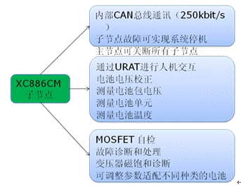控制上述MOSFET工作的是汽車級8位單片機(jī)XC886CM,該單片機(jī)具有8通道10位AD,可以方便的采集各個電池單元的電壓數(shù)據(jù)和溫度數(shù)據(jù)。QFP-48的封裝使它有足夠的IO完成多達(dá)13個MOSFET的控制工作。CAN、SPI、UART等豐富的通信接口使子節(jié)點具有CAN總線通信功能之外,能夠?qū)崿F(xiàn)和PC的通信,以方便試驗階段的控制和演示。硬件乘除單元MDU可進(jìn)行16位數(shù)據(jù)的乘除,實現(xiàn)快速運(yùn)算。