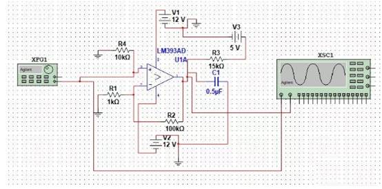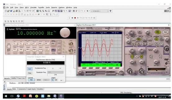 在Multisim軟件中建立圖2所示的仿真環(huán)境,用虛擬的安捷倫信號發(fā)生器和示波器觀察仿真結(jié)果。
