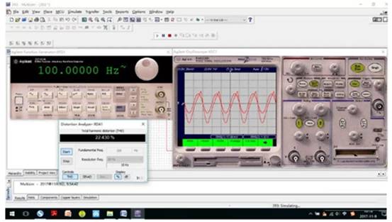 保持輸入信號幅度不變,頻率繼續(xù)增加到100Hz,此時輸出波形已經(jīng)嚴(yán)重失真,幅度也減小很多,有向三角波發(fā)展的趨勢,失真度高達22.430%。