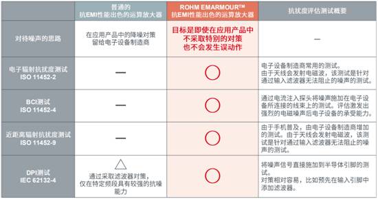 EMARMOUR產(chǎn)品通過了包括“電子輻射抗擾度測試 ISO 11452-2”、“BCI測試 ISO 11452-4”、“近距離輻射抗擾度測試 ISO 11452-9”、“DPI測試 IEC 62132-4”四項國際通行的抗擾度評估測試。朱莎勤介紹道,普通的抗EMI運算放大器一般僅做“DPI測試”,通過采取濾波器對策,僅在特定頻段具有較強的抗噪能力。而羅姆希望簡化工程師針對EMC的設(shè)計,同時也確保產(chǎn)品更加穩(wěn)定,因此通過了四項測試以實現(xiàn)更好的抗干擾性。