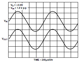 AD8517具有出色的軌到軌輸入和輸出特性,采用低至1.8 V的電源電壓供電。由于該放大器的電源電壓范圍設置為1.8 V,因此共模電壓可設置為1.8 V p-p,使輸出擺幅無需限幅便可達到任一電壓軌。圖1顯示的是在單位增益下測定的輸入和輸出范圍,頻率為22 kHz,VS = 1.8 V,VIN = 1.8 V p-p。
