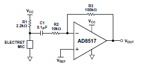 AD8517非常適合用作麥克風前置放大器。圖4顯示了實現(xiàn)方法。放大器增益設置為R3/R2。R1用于偏置駐極體麥克風,C1用于阻隔放大器與直流電壓。
