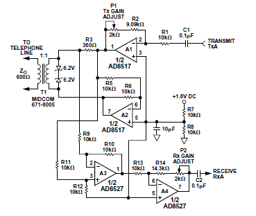 圖5顯示了600 Ω傳輸系統(tǒng)的1.8 V發(fā)射/接收電話線路接口。它允許以差分方式在600 Ω變壓器耦合線路上進行全雙工信號傳輸。放大器A1提供增益,可經(jīng)過調(diào)整以符合調(diào)制解調(diào)器輸出驅(qū)動要求。A1和A2均配置成依靠單電源向變壓器施加最高電平信號。放大器A3配置成差分放大器是出于以下兩個原因:(1)防止發(fā)射信號干擾接收信號,(2)從傳輸線路提取接收信號,以便由A4放大。A4的增益可采取與A1相同的方式調(diào)整,以符合調(diào)制解調(diào)器的輸入信號要求。由于采用標準電阻值,因而可使用SIP(單列直插式封裝)格式的電阻陣列。通過與AD8517的5引腳SOT-23封裝或AD8527的8引腳MSOP及8引腳SOIC封裝耦合,該電路可提供緊湊型解決方案。