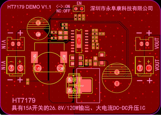 深圳市永阜康科技有限公司針對大功率的DC-DC升壓應(yīng)用需求,推廣一款集成15A開關(guān)管的26.8V、120W輸出、大電流非同步DC-DC升壓IC-HT7179。HT7179采用獨到的電路研發(fā)技術(shù)以及先進(jìn)的半導(dǎo)體工藝,重載時高達(dá)93%以上的工作效率,無需外加散熱器,升壓到26.8V,可穩(wěn)定輸出120W。