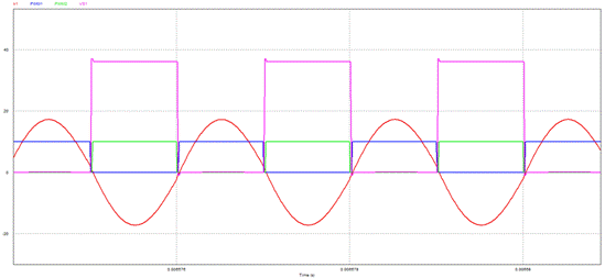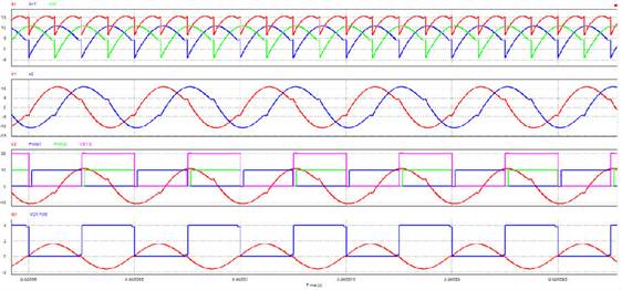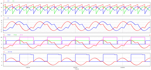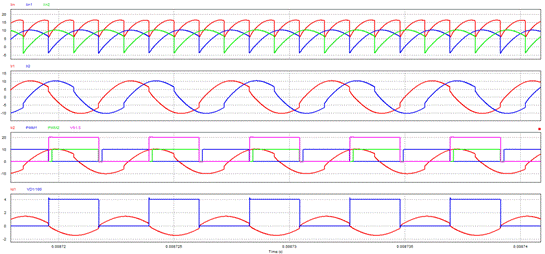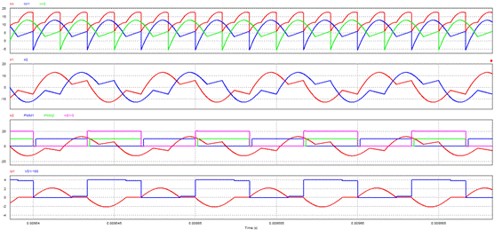 上述 圖中可以看出前級開關管均實現(xiàn)了ZVS,副邊實現(xiàn)了ZCS(圖4中情況除外),半橋相位關系如圖5所示。