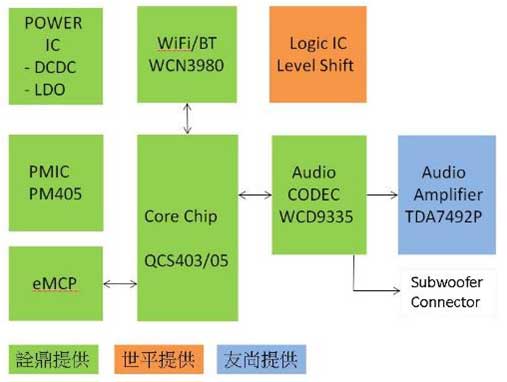 大聯(lián)大詮鼎基于QCS400系列SoC,再搭配PM405電源管理IC及WiFi前端IC - WCN3980,組成高性價比方案的智能音響參考設計方案。