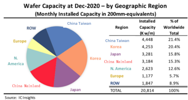 IC Insights表示,中國(guó)臺(tái)灣地區(qū)是8英寸晶圓產(chǎn)能的領(lǐng)先者。在12英寸晶圓方面,韓國(guó)位居前列,中國(guó)臺(tái)灣地區(qū)緊隨其后。三星和SK海力士繼續(xù)積極擴(kuò)大其在韓國(guó)的工廠,以支持其大批量DRAM和NAND閃存業(yè)務(wù)。2020年底,中國(guó)大陸占全球產(chǎn)能的15.3%,與日本幾乎持平。