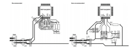旁路電容器。推薦板上的旁路電容器C4比非推薦板上的電容器更靠近MCU。并且從旁路電容器到MCU的布線比不推薦的布線短。特別是在非推薦板上,C4的引線沒有直接連接到VDD和VSS干線。