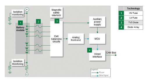 我們已經(jīng)討論了具有高額定電壓的主保險絲模塊的輸出。每個單獨的電池包也應該融合。低壓熔斷器可用于此目的。每個模塊都有自己的微處理器來監(jiān)控電池狀態(tài)并將其報告給主控制器。因此,有線接口應使用 TVS 二極管陣列來保護 CAN 總線。