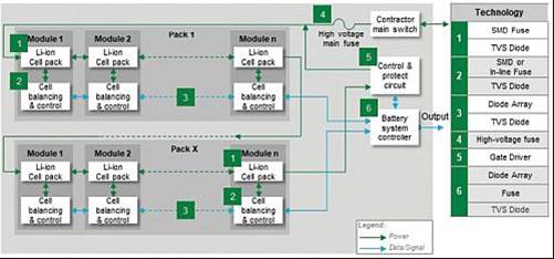 由于 400-500V 電池組可容納數(shù)千瓦時的能量,因此安全性是一個主要問題。例如,一個電池組件中的短路會消耗大量功率并迅速發(fā)熱。尺寸合適的電流中斷裝置和瞬態(tài)過載保護對于避免對車輛電子設備造成災難性破壞以及對車輛乘員的潛在傷害至關重要。