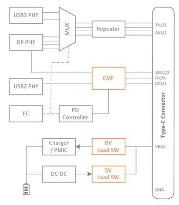 相比早期版本的其他 USB 接口,Type-C 的 VBUS 引腳更容易由于異物或異常插拔與相鄰引腳發(fā)生短路。由于 VBUS 的電壓典型可能高達 20V ,與低壓引腳之間(如CC、SBU、Tx/Rx 等)發(fā)生短接會造成嚴重后果。其次,Type-C 應用的電源路徑需要具有大電流通流能力,對潛在的負載短路、過電流等危險做出有效防護。此外,作為電子設(shè)備的外接接口,ESD 和浪涌的侵害必須從系統(tǒng)層面加以重視,熱插拔等原因造成的過電壓也必須加以考慮。