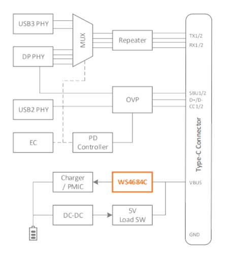 WS4684C-15/TR、WS4683C-16/TR 和 WS3233Q-20/TR 的組合實現(xiàn)了對過壓、過流、過溫、浪涌、ESD 等各種常見干擾異常的保護和抑制,是業(yè)界完善的 USB Type-C 接口保護方案之一。