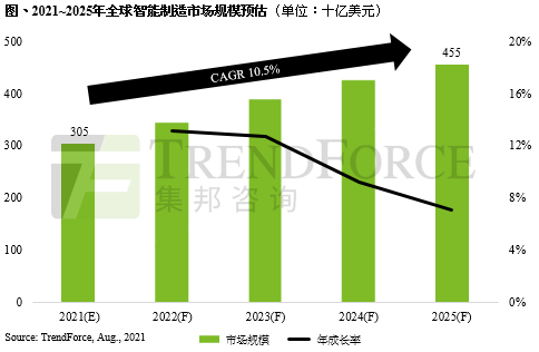 根據(jù)TrendForce集邦咨詢研究顯示,受惠于新冠疫情之下數(shù)字化轉(zhuǎn)型加速,以及遠端作業(yè)、自動化等需求提升,并攜帶5G、深化AI技術(shù)等加值服務(wù),推升2021年全球智能制造市場規(guī)模至3,050億美元,預(yù)期至2025年有望達4,500億美元,年復(fù)合成長率達10.5%,將迎來制造業(yè)黃金五年。