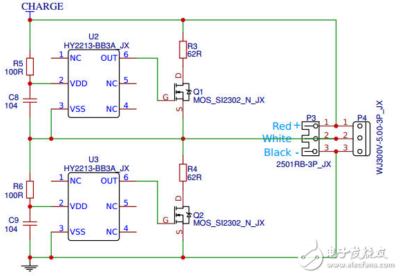 芯片VDD可以檢測單節(jié)鋰電池的電壓,當(dāng)單節(jié)鋰電池的電壓達(dá)到4.2V的時候,芯片的OUT引腳會控制MOS管導(dǎo)通,導(dǎo)通之后鋰電池跟R3電阻形成一個閉環(huán)回路,也就是在R3上需要耗電,這樣R3一耗電,單節(jié)鋰電池的電壓會降低,不讓單節(jié)鋰電池的電壓高于4.2V,起到保護(hù)的作用。