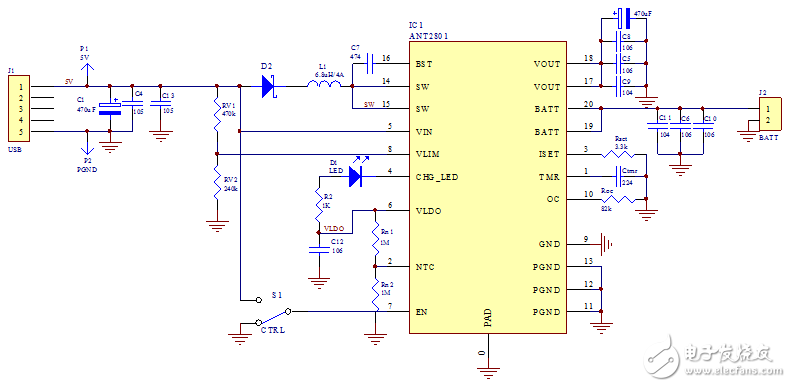 ANT2801內(nèi)部充電管理部分采用一套完整可靠的充電機(jī)制。無論電池是否連接,都可以正常工作。而且無需外部補(bǔ)償來實現(xiàn)芯片的穩(wěn)定。在上電過程中,首先,VIN對VOUT充電,當(dāng)達(dá)到VIN時,SW開始震蕩工作,實現(xiàn)升壓功能,當(dāng)VOUT建立好之后,才開始檢測VBATT狀態(tài)。