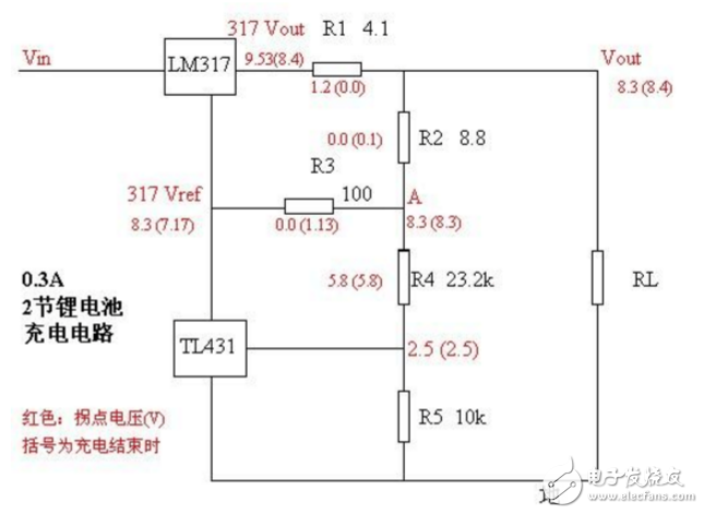 由LM317和R1、R2、R3組成一個典型的恒流電路(431暫時認(rèn)為斷開R4比較大可以先不看)。當(dāng)電壓不太高時保持恒定的充電電流。以兩節(jié)電池充電為例,理想狀態(tài)下,充電電流應(yīng)該是電壓達(dá)到8.3V前一直保持恒定。當(dāng)A點電壓達(dá)到拐點值8.3V時,經(jīng)過R4、R5分壓,TL431開始導(dǎo)通,并把LM317的基準(zhǔn)點電壓從8.3V逐漸拉下。所謂拐點就是指電流開始下降的那點。直到電壓達(dá)到8.4V的0電流點,A點仍然保持這個8.3V電壓,LM317的輸出Vout下降到8.4V,其調(diào)整端下降到7.17V。