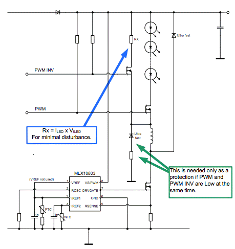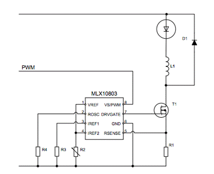 創(chuàng)建LED電流的PWM調(diào)制的最直接方法是將PWM信號(hào)直接施加到MLX10803的電源。MLX10803電路具有非?斓纳想姇r(shí)間,如果PWM信號(hào)具有以下某些給定的特性,則使用以下電路沒(méi)有問(wèn)題。