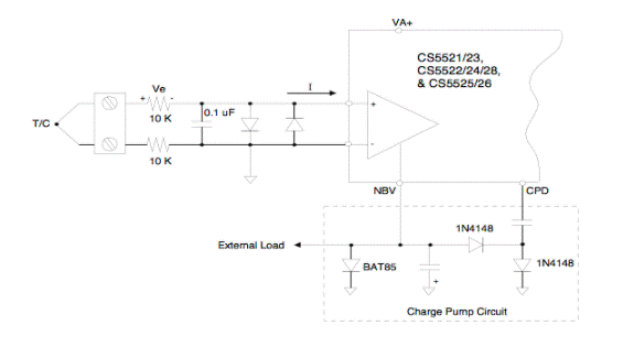 CS5521 / 23,CS5522 / 24/28和CS5525 / 26系列A / D轉(zhuǎn)換器包括一個(gè)斬波穩(wěn)定儀表放大器,用于測(cè)量低電平直流信號(hào)(±100 mV或更小)。該放大器設(shè)計(jì)為產(chǎn)生非常低的輸入采樣電流(-40至+85 + C時(shí)ICVF <300 pA)。如圖1所示,當(dāng)使用高阻抗電路進(jìn)行輸入保護(hù)時(shí),低輸入電流可將熱電偶測(cè)量中可能發(fā)生的誤差減至最小。