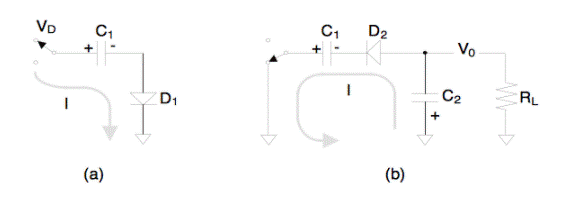 圖2說(shuō)明了基本的二極管電荷泵。晶體管Q1和Q2代表CMOS反相器的輸出晶體管。當(dāng)反相器的輸入導(dǎo)致晶體管Q1導(dǎo)通(Q2截止)時(shí),C1通過(guò)二極管D1充電至大約5 V的電壓減去二極管的正向電壓。當(dāng)逆變器的輸出切換為Q1斷開(kāi),Q2接通時(shí),C1帶正電的導(dǎo)線將接地。由于電容器兩端的電壓不能瞬時(shí)改變,因此連接到二極管D2的C1的引線將變?yōu)樨?fù),從​​而導(dǎo)通二極管D2。C1上的電荷然后將流到C2上并產(chǎn)生負(fù)輸出電壓。電容器C2充當(dāng)電荷的儲(chǔ)存器,并且比電荷泵電容器C1大得多。在經(jīng)過(guò)數(shù)個(gè)電荷泵循環(huán)后,