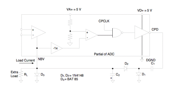 圖4給出了本應(yīng)用筆記中列出的A / D轉(zhuǎn)換器內(nèi)部的基本電荷泵調(diào)節(jié)環(huán)路的簡(jiǎn)化版本。電荷泵驅(qū)動(dòng)引腳(CPD)由XIN頻率產(chǎn)生的時(shí)鐘(CPCLK)驅(qū)動(dòng),可直接使用。CS5521 / 22/23/24/28器件使用XIN / 2 /時(shí)鐘。穩(wěn)壓器環(huán)路將電荷存儲(chǔ)電容器上產(chǎn)生的電壓幅度與VA +電源幅度的一部分進(jìn)行比較。該環(huán)路旨在將NBV的電壓調(diào)節(jié)為– [VA + / 2.38]V。請(qǐng)注意,如果芯片的VA +電源電壓高于+5 V,則NBV上的電荷泵輸出的電壓為成比例的更負(fù)面。當(dāng)NBV引腳上的電壓達(dá)到適當(dāng)?shù)姆葧r(shí),電荷泵時(shí)鐘的周期將被刪除。調(diào)節(jié)環(huán)路將來(lái)自CPD引腳的脈沖頻率保持在產(chǎn)生適當(dāng)輸出電壓的平均頻率。CPD驅(qū)動(dòng)器輸出由VD +電源提供,如圖4所示?梢詾+5 V或+3V。圖4所示的二極管電荷泵用于+5 V電源。肖特基二極管D3確保NBV引腳的接地降落不超過(guò)二極管的壓降。這樣可以確保調(diào)節(jié)器環(huán)路正確啟動(dòng)。