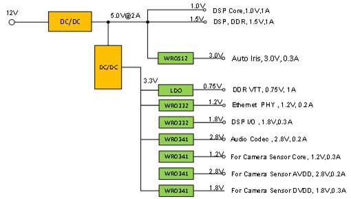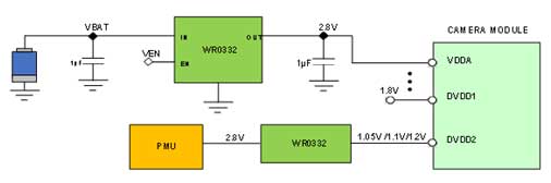 CMOS Image Sensor(圖像傳感器)需要三路電源(Core,Analog和I/O),其中2.8V為模擬電壓,1.8V為I/O數(shù)字電壓,1.2V為核電壓。此時,通過維安WR0332外置低壓差線性穩(wěn)壓器(LDO)為CMOS Image Sensor供電,可將集中在IC的熱量分散開,抑制整個電路的發(fā)熱量,實現(xiàn)高轉換效率,有助于進一步降低手機攝像頭模塊的功耗。特別是應用于 AVDD時,優(yōu)秀的紋波抑制能力1KHz@70dB ,還能顯著較少電源線干擾噪聲,為CMOS圖像傳感器穩(wěn)定供電。另外核電壓部分,維安還開發(fā)設計了1.0V~1.2V輸出的規(guī)格,可根據(jù)用戶的需求選擇不同的電壓給Core供電。
