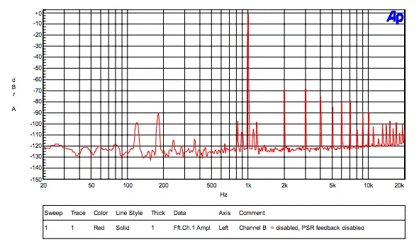 4.在僅打開通道A PWM輸出的情況下,使用模擬分析儀(例如Audio Precision),對通道A進(jìn)行幅度與頻率的FFT。1 kHz音調(diào)應(yīng)具有-1 dBFS的幅度。圖1顯示了僅啟用一個通道A作為基線的結(jié)果。