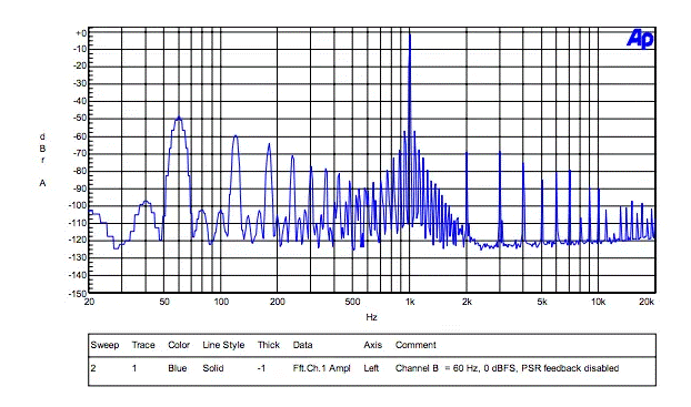 3.使用數(shù)字音頻源(例如Audio Precision),將通道A設(shè)置為-1 – dBFS,1 kHz正弦波,將通道B設(shè)置為0 dB,60 Hz正弦波。通道B用于模擬廉價,調(diào)節(jié)不良的電源產(chǎn)生的諧波。通道B的60 Hz開關(guān)輸入將在軌上產(chǎn)生相應(yīng)的紋波電壓,該紋波電壓將耦合到被測通道,在這種情況下為通道A。