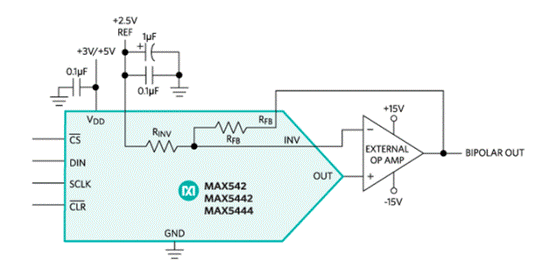 單極性,16位,無(wú)緩沖DAC可以通過(guò)添加外部精密運(yùn)算放大器來(lái)執(zhí)行雙極性操作。這種配置的兩個(gè)例子是16位MAX542和MAX5442 DAC,它們使用集成的0.015%(最大)匹配縮放電阻RFB和RINV,以實(shí)現(xiàn)簡(jiǎn)單的雙極性輸出擺幅(圖2)。